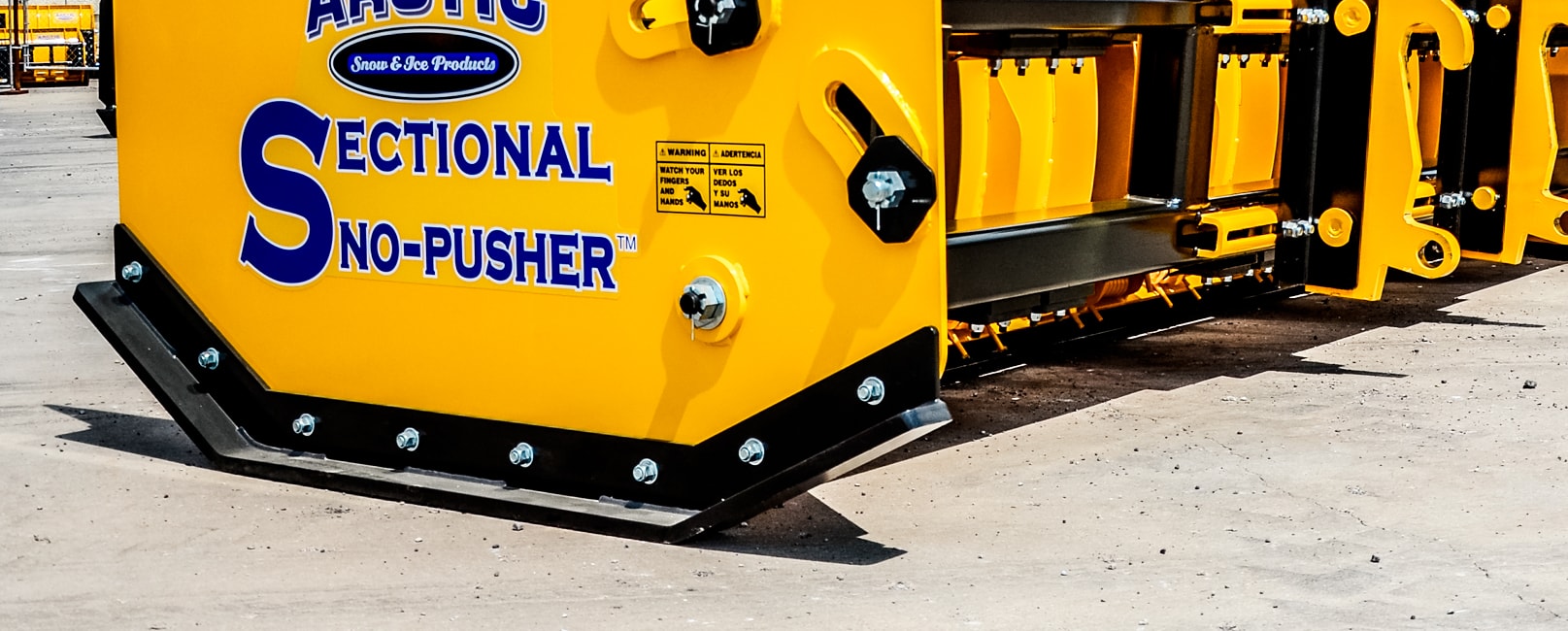 Patented mechanical wings lift up ~9″ to go over curbs, manholes, or other hazards—giving ~75% more clearance than many competitive pushers. - Polyurethane Mounting Blocks (“Polyblocks”)
